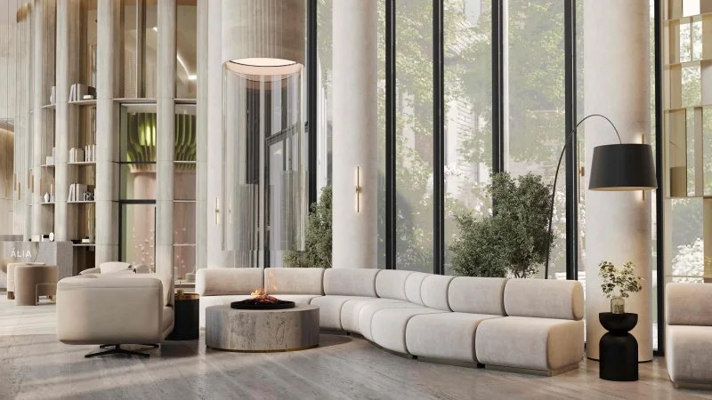 Представлен проект гранд-лобби в новой очереди жилого района ÁLIA. Об этом «Стройгазете» сообщили в пресс-службе девелопера проекта — компании Asterus, уточнив, что пространство площадью 200 кв. метров объединит две премиальные башни ÁLIA ALIVE высотой 39 и 42 этажа и станет частью инфраструктурных решений для резидентов четвертой очереди застройки района.