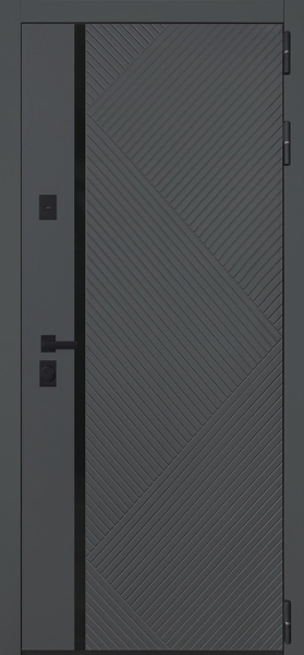 Здесь технологии и эстетика договорились. Внешняя панель — экошпон МДФ с объемной фрезеровкой цвета «графит», глянцевая вставка из черного лакобеля и порошковое покрытие «муар черный» придают модели выразительность. Внутри — белая матовая панель с таким же акцентом, создающая визуальный баланс. Черная фурнитура завершает образ в духе «хайтек» и «техно». Дверь выглядит как интерьерное произведение, а не просто вход.