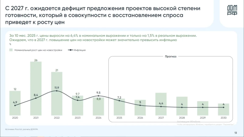 В России в 2027 году на фоне низкого предложения цены на жилье могут вырасти в два раза выше инфляции. Об этом заявил руководитель аналитического центра ДОМ.РФ Михаил Гольдберг на пресс-конференции в Москве, посвященной итогам 2025 года.