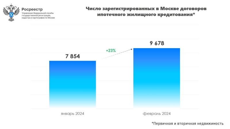 В феврале 2024 года управлением Росреестра по Москве зарегистрировано 9 678 договоров ипотечного жилищного кредитования на первичном и вторичном рынках недвижимости. К январю текущего года рост числа зарегистрированных ипотек составил 23%. Об этом сообщил руководитель управления Игорь Майданов.