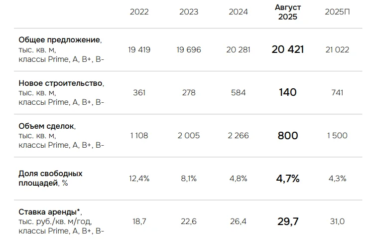 По ее словам, на август 2025 года объем общего предложения на рынке офисной недвижимости класса Prime, А, B+, B- составляет порядка 20,4 млн кв. метров, а под конец года ожидается незначительный рост к 21 млн кв. метров.