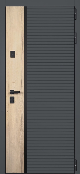 Внешняя отделка выполнена из металла толщиной 1,5 мм и панели МДФ с экошпоном в цветах «графит» и «дуб галиф натур». Объемная фрезеровка, вертикальная вставка из черного глянцевого лакобеля и гладкий наличник придают двери стильный вид. Внутренняя панель в белом матовом исполнении с фрезеровкой гармонично вписывается в любой интерьер. Металлические элементы покрыты порошковым составом «муар черный», а фурнитура выдержана в элегантном черном цвете. Это не просто барьер, а полноценный элемент интерьера.