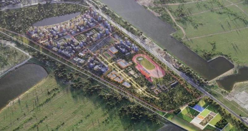 Социальная инфраструктура предполагает строительство школы на 2450 мест и три детских сада на 900 мест. Отдельное внимание в проекте будет уделено зеленым зонам: тут разместятся парк, пруд и несколько скверов.