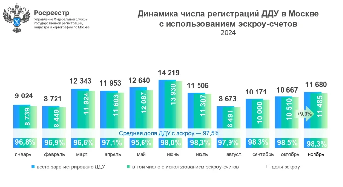 В Москве в ноябре 2024 года зарегистрировано 11 485 договоров долевого участия в строительстве на рынке жилой и нежилой недвижимости с использованием эскроу-счетов. Показатель вырос к предыдущему месяцу (10 510 ДДУ) на 9,3%. Об этом сообщил руководитель Управления Росреестра по Москве Игорь Майданов.