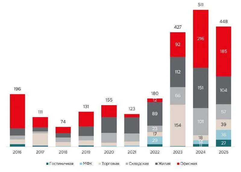 Несмотря на стабильный общий объем вложений по России в 2023–2024 годах, динамика в сегментах различается. В жилой недвижимости за январь–сентябрь 2025 года объем вложений снизился до 131 млрд рублей, что в 1,6 раза меньше, чем за тот же период 2024 года. В коммерческой недвижимости общий объем инвестиций, наоборот, вырос на 5% по сравнению с 2024 годом и достиг рекордных 475 млрд рублей за три квартала 2025 года.