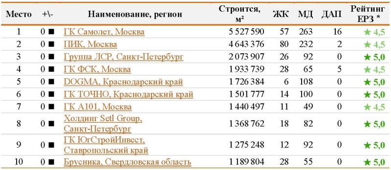 Остальные застройщики из числа ТОП-10 также сохранили свои места.