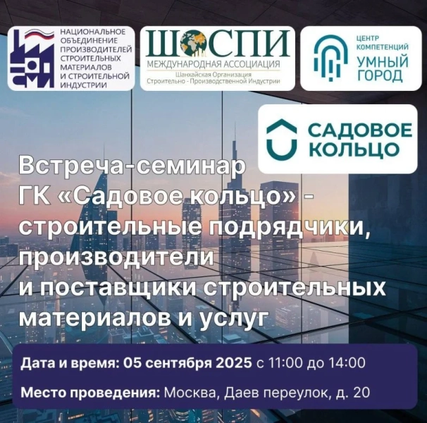 5 сентября 2025 года Ассоциация НОПСМ совместно с Международной Ассоциацией ШОСПИ и Центром компетенций «Умный город» приглашает вас на встречу-семинар с ГК «Садовое кольцо». Об этом «Стройгазете» рассказали представители мероприятия. Встреча пройдет в Москве, в деловом центре «ДаевПлаза» (Даев переулок, 20). Начало 11.00