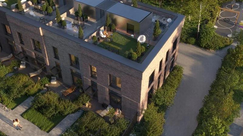 Архитекторы из бюро METROPOLIS придумали композиционную форму жилого квартала, где к одному из секционных домов пристроен блок таунхаусов с эксплуатируемой кровлей. Каждый из них имеет два этажа, отдельный вход, большие окна, потолки высотой от 3,35 метров и две террасы — у входа и на собственной крыше. Площадь таунхаусов варьируется от 164 до 187,3 кв. метров. В трех лотах есть возможность установки дровяного камина. Фасадные решения таунхаусов созвучны примыкающим высотным секциям и имеют видовое взаимодействие с окружающей средой.