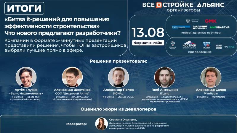 13 августа на портале Всеостройке.рф прошла «Битва it-решений для повышения эффективности строительства». В формате 5-минутных презентаций разработчики представили свои it-продукты, а ТОПы крупнейших застройщиков выбрали лучшие из них прямо в эфире.