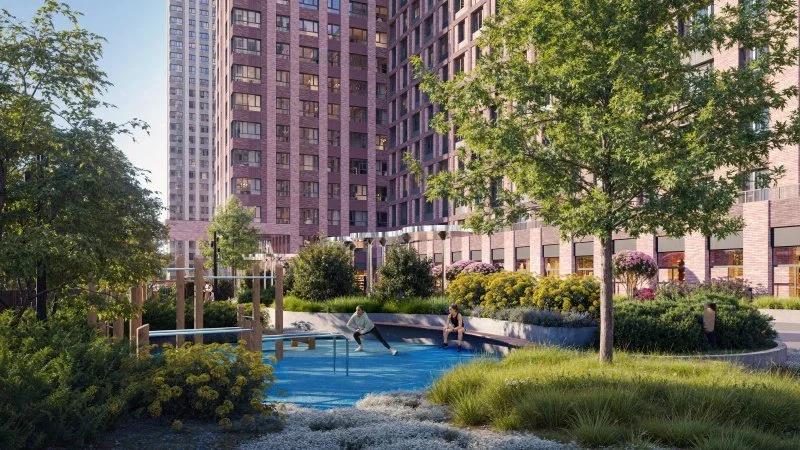 Благоустройство проекта составит почти 6 тыс. кв. метров, всесезонное озеленение — более 1 тыс. кв. метров. Двор будет представлять собой многообразие функциональных «комнат»: пешеходные зоны (свыше 3,2 тыс. кв. метров) — событийная площадь с амфитеатром, места отдыха с качелями, коворкинг на свежем воздухе, спортивные (467,4 кв. метров) и детские (488 кв. метров) площадки с эко-инвентарем и другое. Элементы геопластики во дворе погрузят жителей в атмосферу приватности, а зеркальные МАФы создадут иллюзию просторного зеленого сада.