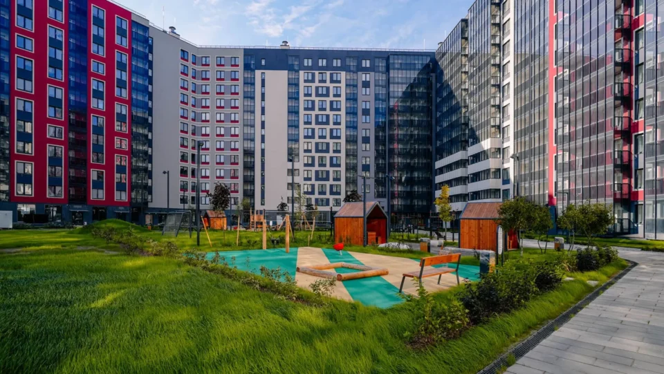 Безопасность и комфорт. В подъездах домов обустроены помещения для колясок и спортивного инвентаря, а вход в дома осуществляется с уровня земли. Во дворах, свободных от машин, создана безбарьерная среда. На территории и во входных группах установлены системы видеонаблюдения.