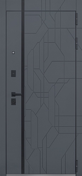 Дизайн, который говорит за себя: снаружи — экошпон «графит», дизайнерская фрезеровка, вставка из черного лакобеля и широкие наличники. Всё продумано: от муарового порошкового покрытия до выразительных линий.