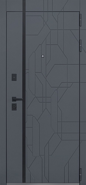 Дизайн, который впечатляет с порога. Снаружи — графитовая МДФ-панель с объемной фрезеровкой и черной вставкой из лакобеля.