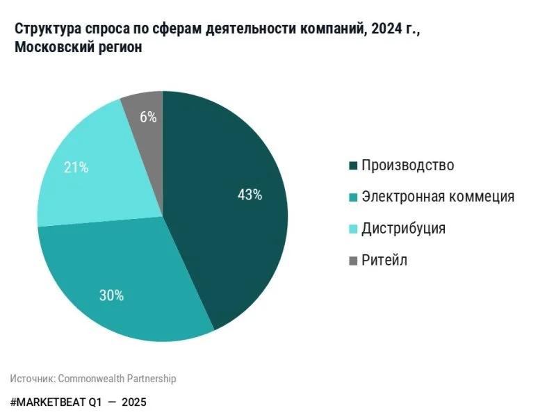 Сумма купленных и арендованных площадей в сегменте Light Industrial в Московском регионе составила 54 тыс. кв. метров по итогам I квартала 2025 года. Ключевым интересантом по наращиванию складских площадей этого формата стала сфера производства, которая составила 43% от общего объема спроса. Впервые e-comm занял значительную долю в общем объеме показателя, сместив второго традиционного лидера – сферу дистрибуции. Доля онлайн-торговли достигла 30% за счет одной крупной сделки маркетплейса Wildberries в логистическом комплексе Гранат (16 454 кв. метров).