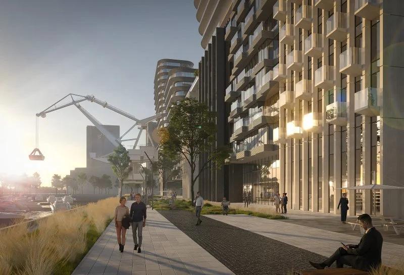 Ключевой особенностью проекта станет вертикальная многоуровневая структура набережной: на воде разместятся объекты на понтонах, а на высоте 30 метров будет построен прозрачный парящий ярус с зеленым променадом и панорамными видами.
