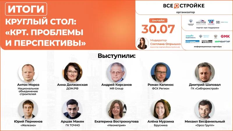 Круглый стол на тему «КРТ. Проблемы и перспективы» прошел 30 июля в прямом эфире портала Всеостройке.рф. ТОПы крупнейших девелоперов, исходя из своего опыта, рассказали о существующих проблемах КРТ и обсудили способы их решения.