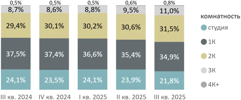 На фоне ограниченного пополнения рынка новостроек массового сегмента Москвы отмечено сокращение доли студий (21,8%, -2,1 п.п. за квартал) и однокомнатных форматов (34,9%, -0,5 п.п.) в структуре предложения как лотов с наиболее быстрым циклом реализации. Такие данные «Стройгазете» предоставили аналитики компании «Метриум», которые уточнили, что в целом объем предложения на первичном рынке массового сегмента Москвы за квартал сократился на 15%.