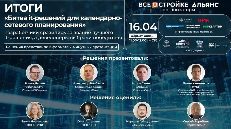 16 апреля на портале Всеостройке.рф прошла «Битва it-решений для календарно-сетевого планирования». В формате семиминутных презентаций разработчики представили свои it-продукты, а ТОПы крупнейших застройщиков выбрали лучшие из них прямо в эфире.