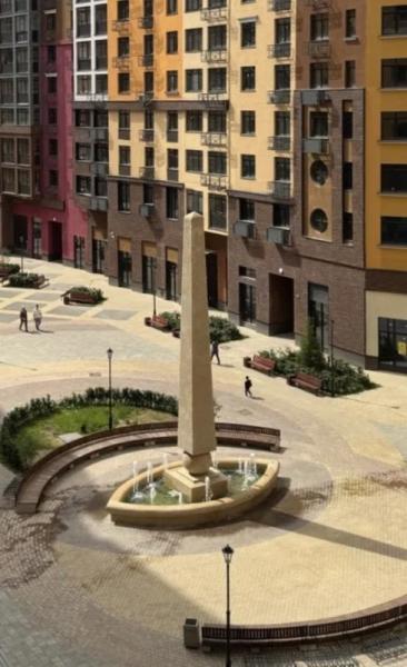 Фонтан высотой 12 метров и весом около 20 тонн изготовлен из уникального материала — цветного бетона с добавлением натуральной каменной крошки. Форма объекта представляет собой стеловую композицию на сферическом основании, расположенную в центре символической композиции, имеющую овальную форму. Фонтан органично интегрирован в общественную зону жилого комплекса и подчёркивает перспективу центрального бульвара, связывая вместе в единую визуальную композицию два многосекционных здания.