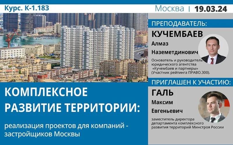 Курс лекций на тему «Комплексное развитие территории: реализация проектов для компаний-застройщиков Москвы» прочитает Алмаз Кучембаев – градостроительный юрист с двадцатилетним стажем, участвовавший в более чем десяти проектах КРТ, Вторым спикером приглашен к участию заместитель директора департамента комплексного развития территорий Минстроя РФ Максим Галь.