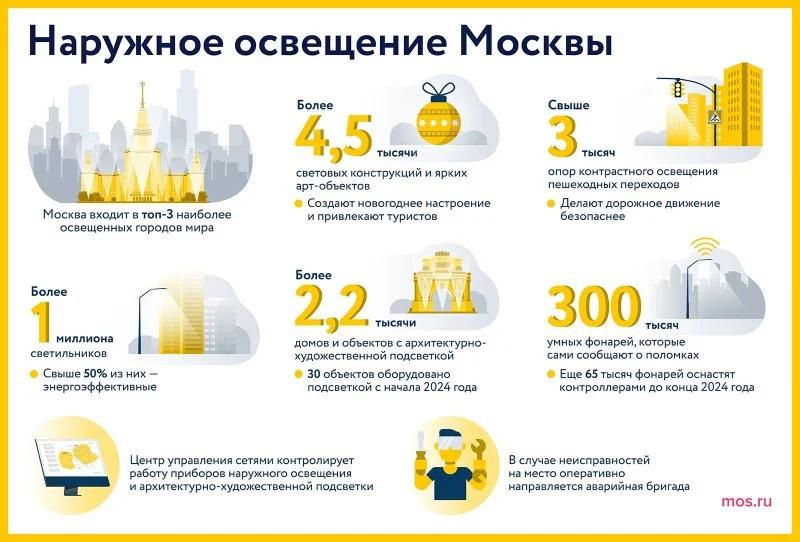 Больше трети объектов наружного освещения Москвы оборудовано умными датчиками дистанционного контроля, которые следят за работой ламп. Энергетики на расстоянии могут включать или выключать подсветку, регулировать напряжение. Благодаря этому в городе всегда красиво, светло и безопасно.