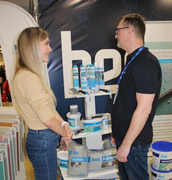 Компания «КНАУФ ГИПС» выставила на стенде линейку товаров для плиточных работ и создания основания под различные типы плитки. В том числе — широкую номенклатуру клеевых составов, монтажной пены, продуктов для гидроизоляции, а также листовых влагостойкие материалов для создания перегородок, включая новинку — гипсокартонные листы «Аквамарин» образца 2023 года.