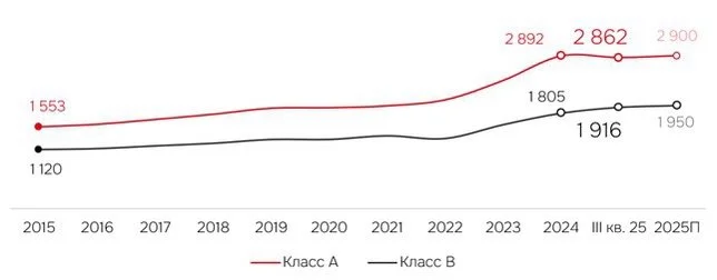 В офисах класса А по итогам III квартала средневзвешенная ставка составила 2,8 тыс. рублей за кв. метр в месяц (включая НДС и OPEX, но не включая КУ), что превышает показатель год к году менее, чем на 1%. По сравнению с IV кварталом 2024 года индикатор снизился всего на 1%. На фоне продолжающегося роста цен на строительство и материалы к концу 2025 года показатель может зафиксироваться на уровне 2,9 тыс. рублей за кв. метр в месяц (включая НДС и OPEX).