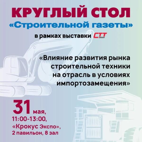 31 мая с 11.00 до 13.00 в рамках ведущей отраслевой выставки страны CTT Expo, «Строительная газета» проведет круглый стол: «Влияние развития рынка строительной техники на отрасль в условиях импортозамещения». Мероприятие пройдет в зале 8 павильона 2 в МВЦ «Крокус Экспо».