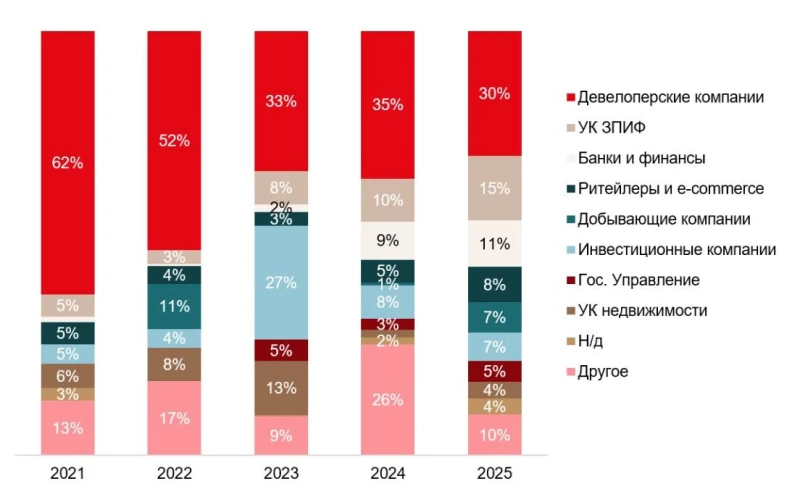 В 2021-2022 годах на долю девелоперских компаний приходилось более половины объема транзакций, а в 2025 году значение сократилось до 30% (-5 п.п. г/г). Об этом «Стройгазете» сообщили в пресс-службе IBC Real Estate, уточнив, что в абсолютных значениях за восемь месяцев объем таких инвестиций составил 124 млрд рублей сократившись на 44% с 220 млрд рублей за аналогичный период прошлого года.