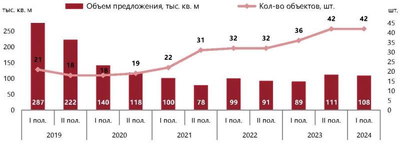 «За последние пять лет (с I полугодия 2019 года по I полугодие 2024 года) предложение сократилось в 2,7 раза, с 9,9 тыс. лотов до 3,6 тыс. лотов, а число комплексов, где предлагаются апартаменты, за этот период, напротив, увеличилось в два раза – с 21 до 42 . Это связано с увеличением числа небольших по проектному объему объектов в экспозиции: если в 2019 году среднее количество лотов в проектах, представленных на первичном рынке, составляло 1 тыс. юнитов, то по итогам I полугодия 2024 года этот показатель был существенно ниже – 465 лотов», — указали в NF Group.