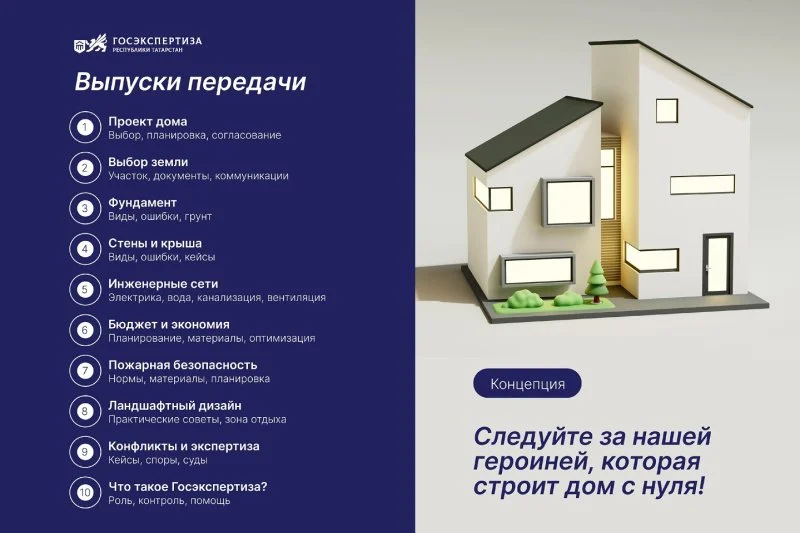 Ведущая вместе с экспертами Госэкспертизы РТ на реальных примерах и ошибках разбирает, как строить правильно, надежно и без лишних затрат. Программа включает десять выпусков и выходит два раза в месяц по средам. Каждый выпуск длится 13 минут и посвящен ключевой теме.