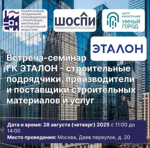 28 августа (в четверг) ассоциация НОПСМ совместно с Международной ассоциацией «ШОСПИ» и Центром компетенций «Умный город» проведут встречу-семинар с ГК «Эталон» для специалистов строительной отрасли. Об этом «Стройгазете» рассказали представители мероприятия.
