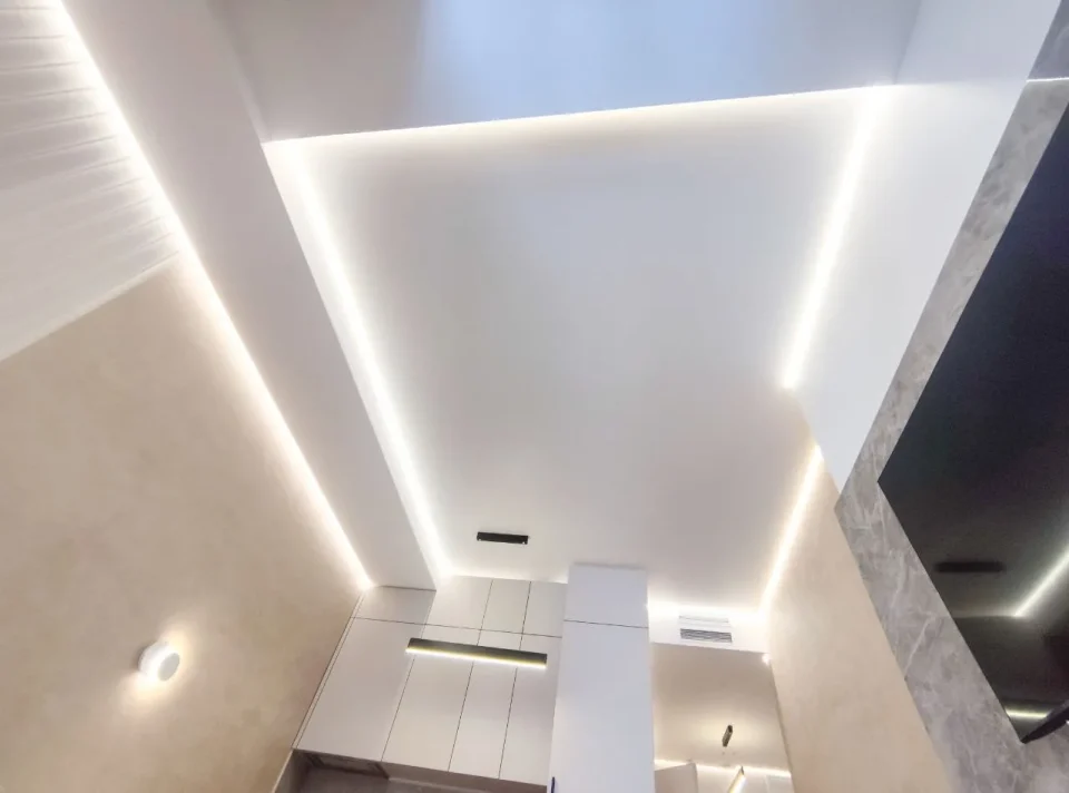 - Варианты дизайна и возможности индивидуальной настройки — ключевые преимущества натяжных потолков. Они могут быть подобраны практически под любое помещение, включая криволинейные потолки или потолки неправильной формы. Гибкость материалов натяжных потолков позволяет креативно организовать освещение, например, встраиваемое освещение, светодиодные ленты или точечные светильники, которые могут улучшить атмосферу и функциональность помещения. Также доступны встроенные акустические решения для улучшения качества звука и снижения уровня шума в таких помещениях, как офисы, классы или аудитории.