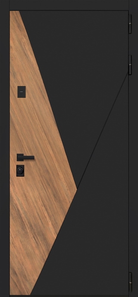 Комбинация цвета «шагрень черная» и МДФ «дуб старый» подчеркивает стиль и статус. Гладкий наличник и порог из нержавеющей стали создают цельный, уверенный образ, подходящий как для квартиры, так и для офиса.