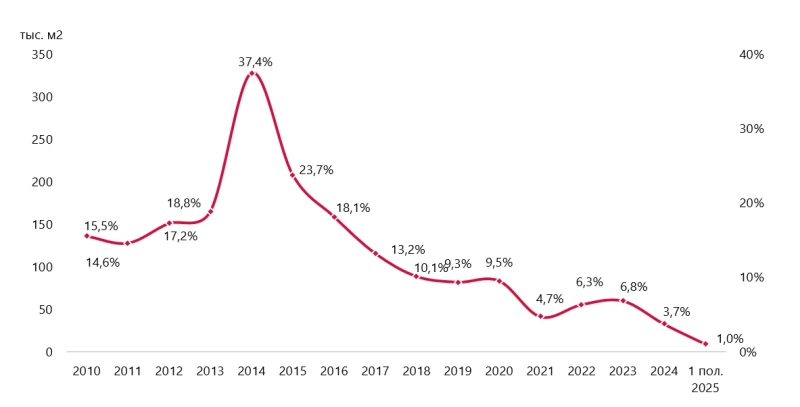 В структуре спроса по объему площадей преобладают сделки купли-продажи. Однако в I полугодии 2025 года на фоне рекордно низкой вакантности общий объем сделок в рассматриваемом кластере сократился на 73% по сравнению с аналогичным периодом прошлого года. При этом 87% сделок за указанный период пришлись на аренду, что связано с фактическим отсутствием предложения первичных офисных площадей на продажу.
