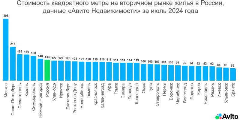 По стоимости за «квадрат» самое доступное жилье на вторичном рынке среди городов исследования расположено в Брянске (79 тыс. рублей за кв. метр), Ульяновске (83 тыс. рублей), Ижевске (84 тыс. рублей), Рязани, Ярославле и Кирове (по 92 тыс. рублей). Самые высокие цены — в Москве (395 тыс. рублей) и Санкт-Петербурге (217 тыс. рублей).